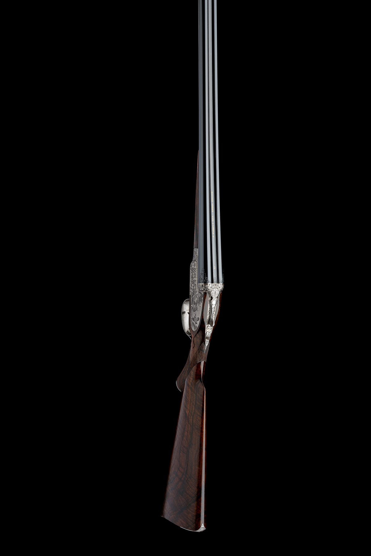 for 1989, 28in. nitro chopperlump barrels, the rib gold-inlaid 'J. PURDEY & SONS. LONDON. ENGLAND.' and '2', the breech ends carved with bold foliate detailing, 2 3/4in. chambers, bored approx. bored approx. 1/4 and 1/2 choke, self-opening action with removable striker discs, the toplever gold-inlaid '2', automatic safety with gold-inlaid 'SAFE' detail, the fences carved in high relief with grape and vine motifs on a finely matted background, the action, lockplates and furniture finely engraved with bold scrolling acanthus and foliage with fine matting to the background and bordering exceptional game scene vignettes, the left lockplate with a covey of French partridge in flight, the right lockplate with a brace of mallard, the underside with a lone woodcock, all set in their naturalistic habitats and each lockplate signed 'P. COGGAN', the triggerguard engraved with a Tudor rose and gold-inlaid with the serial number, bright finish with colour-hardening to the face and flats, 14 1/2in. highly-figured pistolgrip stock with engraved steel pistolgrip-cap and steel heel and toe plates, the fore-end iron engraved en suite, weight 5lb. 15oz., with a leather slip