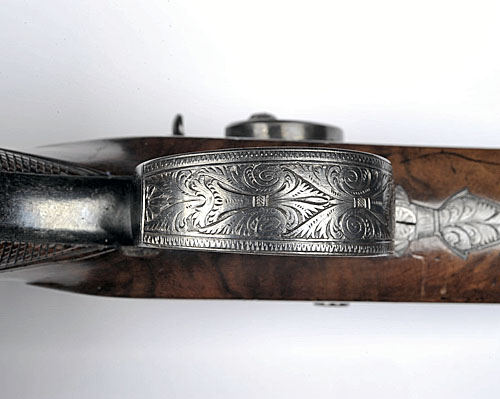 circa 1825, with 10 1/4in. twist sighted barrels each with concave sighting flat, border and scroll engraved breeches each with short gold-inlaid line, border and scroll engraved tangs and bolted locks, the latter each signed 'THOS. TURNER HALIFAX', figured walnut half-stocks each with chequered butt (one butt cracked through and repaired), silver escutcheons, barrel-bolt escutcheons and fore-end caps, border and scroll engraved trigger-guards, and brass-tipped ramrods, one with worm (some pitting to barrels, iron parts discoloured), Birmingham proof marks, in associated lined and fitted case with accessories including flask and iron pincer-type bullet-mould.