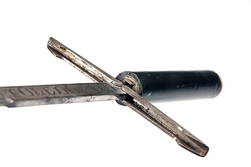 the pommel with a silver cap embossed with a horseman and hallmarked for Chester 1889, the straight single-edged 21in. shortened blade with full length fuller and etched with scrolls and the word 'TOLEDO' both sides of the etched cross-guard folding against the blade and originally spring-loaded, signature to both sides of the forte, plain re-blackened malacca hilt and matching plain re-blackened scabbard, iron ferrule, 34in. overall, locking catch at fault