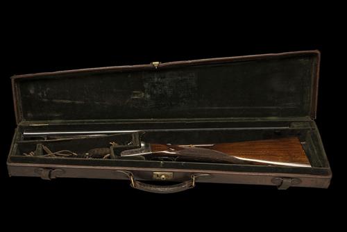 28in. nitro barrels, the rib engraved 'G.E. LEWIS & SONS. 32 & 33. LOWER LOVEDAY ST. BIRMINGHAM.', 2 3/4in. chambers, bored approx. 1/2 and 3/4 choke, treble-grip action, automatic safety with gold-inlaid 'SAFE' detail, border and acanthus scroll engraving surrounding vignettes of partridge and pheasant, retaining traces of original colour-hardening and finish, 14 1/4in. replacement stock, weight 6lb. 8oz., in a lightweight leather 'violin' case
