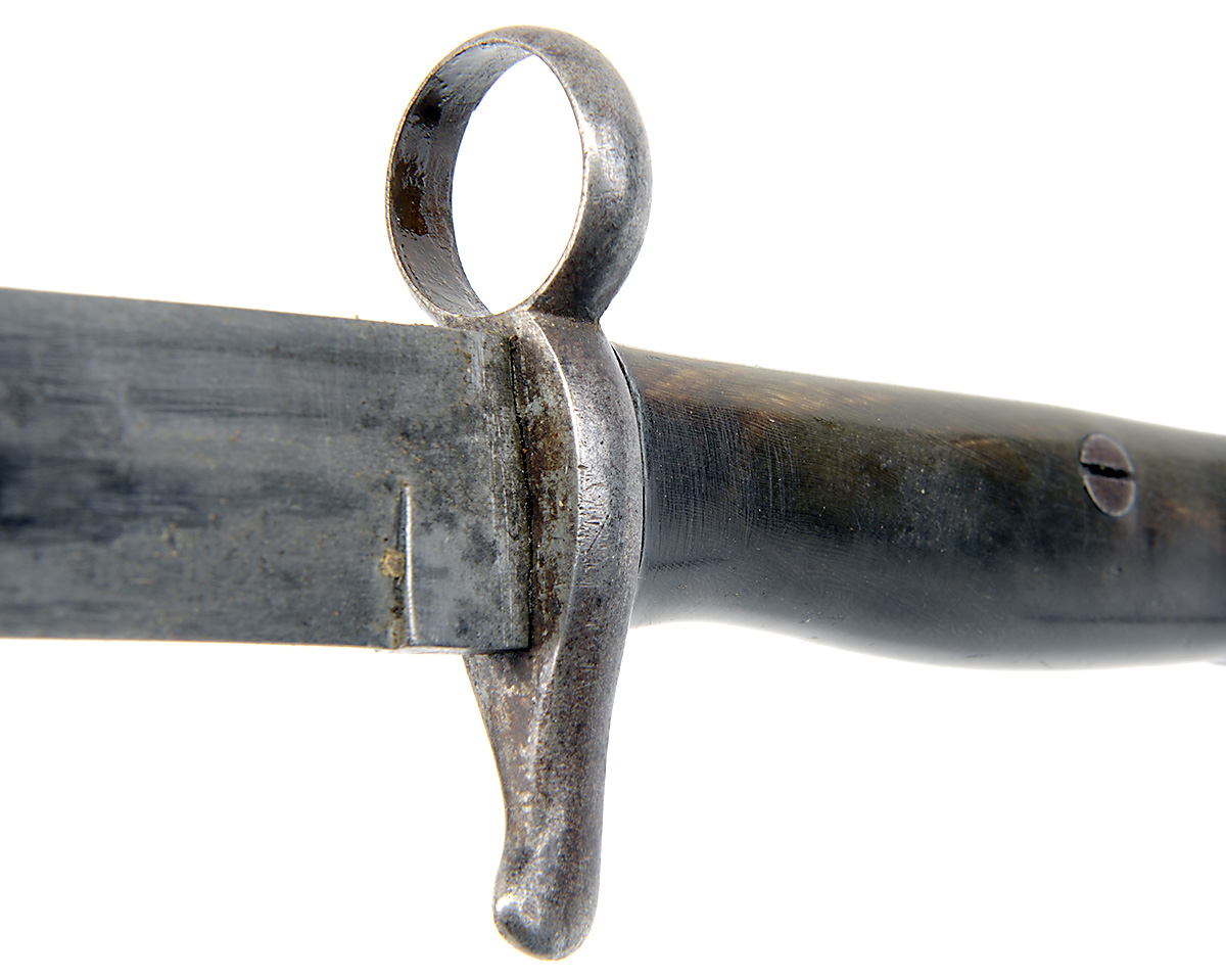 circa 1870, with octagonal 6in. barrel, the muzzle stepped and radiused, applied fore-sight, sighting notch to the hammer nose, open iron frame, plain six-shot cylinder with external ratchet locking, plunge ejector, upwards hinged loading gate, chequered walnut grip and guarded trigger, the pistol lightly cleaned with some pitting and staining and together with its rare sporting bayonet with 6 1/4in. clip-point blade false edged for the last 2in., muzzle ring and straight quillion to the iron cross-guard, polished smooth horn scales and push-button release catch, complete with its iron-mounted leather scabbard