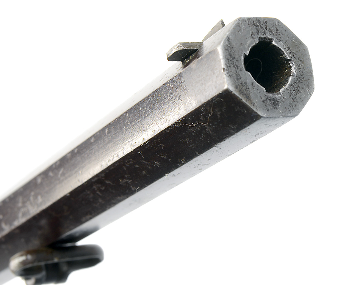 Continental circa 1850, with octagonal 19in. barrel, dove-tailed blade fore-sight, dove-tailed adjustable rear-sight, large rotary tap with long lever mounted to the right hand side, push-button bolt release, the side of the action under the lever marked 'CAL 0,34' and '6 GRAN PULV', walnut half-stock with chequered straight-hand wrist, raised angular cheek-piece and schnabel fore-end, iron furniture, strong traces of finish