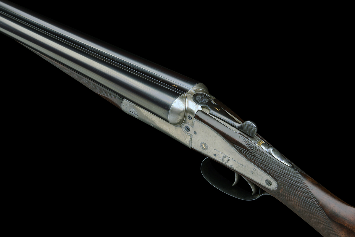 for 1897, 30in. nitro barrels, the rib engraved 'HOLLAND & HOLLAND. 98 NEW BOND STREET. LONDON.', and gold-inlaid '1' at the breech-end, 2 1/2in. chambers, bored approx. true cyl. and 3/4 choke, action with patent gas checks, toplever gold-inlaid '1', automatic safety with gold-inlaid 'SAFE' detail, border engraving, brushed bright and blued finish overall,13 1/2in. figured stock including buttplate, weight 6lb. 8oz., in leather single guncase