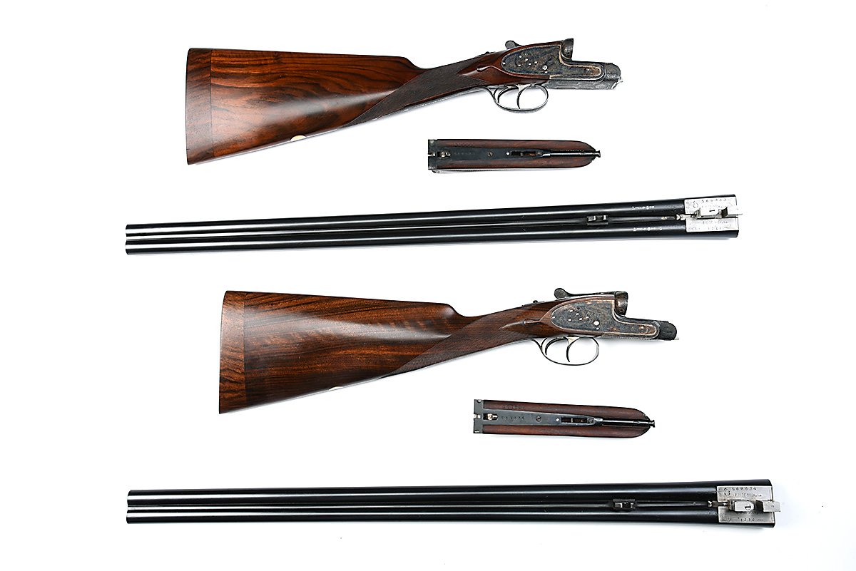 for 1982, 28in. nitro chopperlump barrels (No.1 reproved in 2022), 2 3/4in. chambers, bored approx. imp. cyl. and 1/4 choke, toplevers gold-inlaid '1' and '2', removable striker discs, automatic safeties with gold-inlaid 'SAFE' details, hand-detachable lockplates, gold-inlaid cocking-indicators, articulated front triggers, rolled-edge triggerguards, fine acanthus scroll engraving with floral bouquets, retaining much original colour-hardening and finish, 15 5/8in. figured stocks including 1 1/8in. wooden extensions, No.1 with crack to left underhorn, weight 6lb. 11oz.