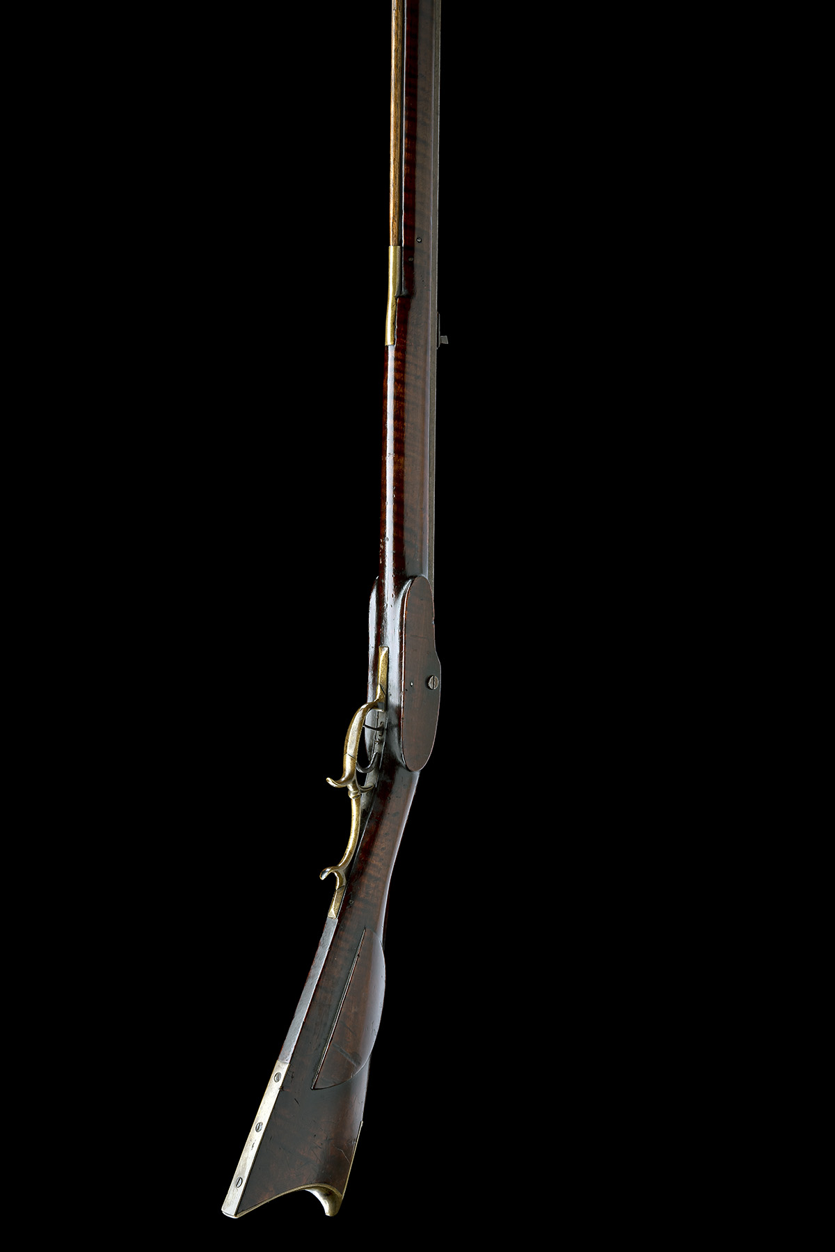 made for export circa 1850, with round 39in. browned barrel, Tower proofs (?), hooked breech, bead fore-sight, shallow sighting groove to the top-tang, square-fronted borderline engraved bar-action lock signed 'SAMUEL MOORE, WARRANTED' below the drum and nipple, sparse acanthus leaf engraved detail, walnut half-stock chequered at the wrist, iron furniture except white metal escutcheon behind top-tang, barrel-key escutcheons and ramrod throat and original under-barrel ramrod (worm tip missing)