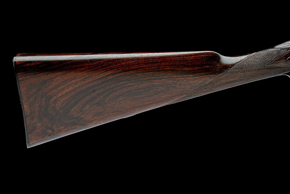 circa 1897, 25 1/2in. replacement nitro barrels, 2 1/2in. chambers, bored approx. true cyl. and 1/2 choke, treble-grip action, automatic safety with gold-inlaid 'SAFE' detail, beaded border and acanthus scroll engraving, brushed bright finish, 14 1/4in. stock (cast on for a left-hander) including buttplate, weight 5lb. 11oz.