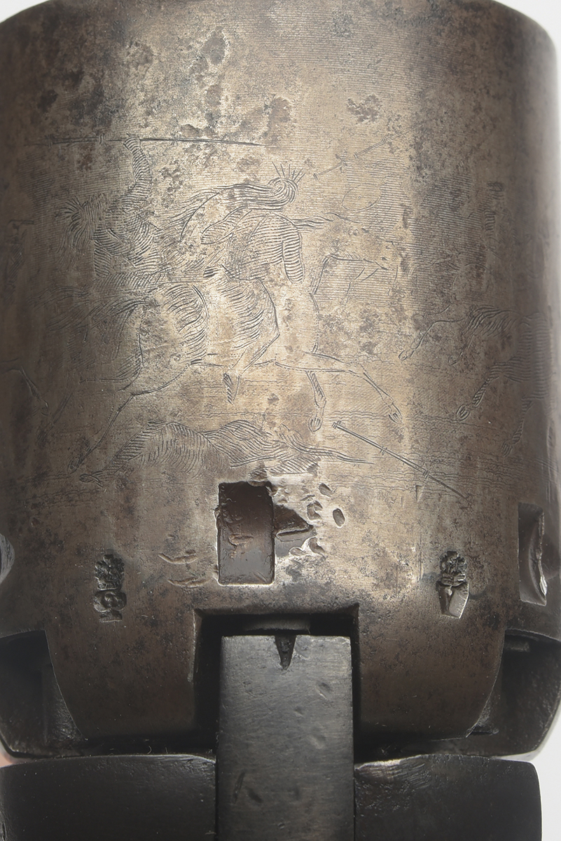 with 7 1/2in. sighted barrel the top flat stamped 'ADDRESS SAML. COLT NEW YORK CITY', the barrel lug stamped with London proofs, open top frame stamped on the left 'COLT'S / PATENT', six shot London proofed cylinder, with safety pins and etched with the famed scene of Texas Rangers fighting Native American Indians with 'MODEL U.S.M.R'. in a decorative box with serial number and 'COLT'S PATENT' below (faint and with some bruising to the cylinder) silver plated brass trigger-guard and back-strap, one piece walnut grips, the revolver is contained in its original green baize lined and partitioned oak case, the front with inset brass locking bolts, the inside lid with its original instruction label, accessories include its correct copper bodied flask by Hawksley with long adjustable nozzle, double cavity brass mould, cleaning rod, oil bottle, also included is the case key, the revolver is quite sharp and crisp overall, with excellent grips, much silver plating to the trigger-guard and back-strap, and all matching numbers