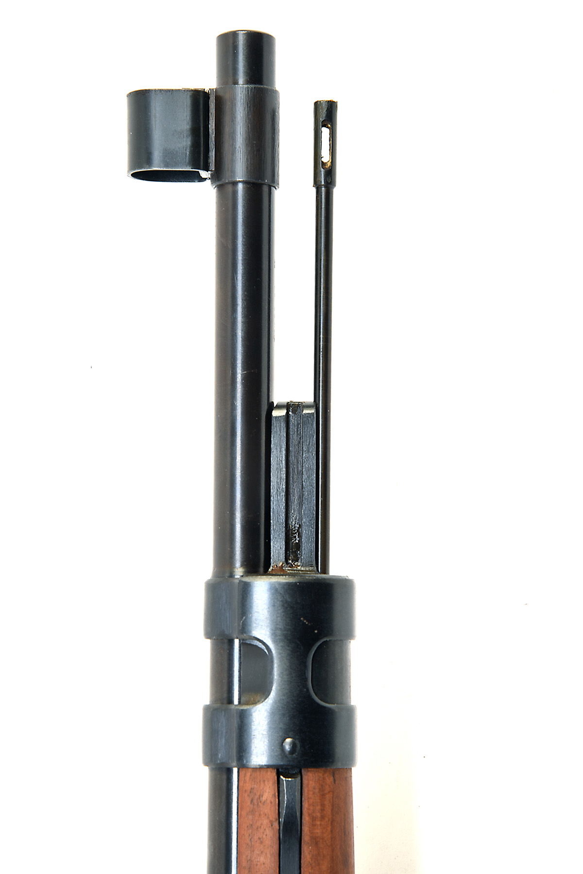 dated 1941, 23 3/4in. nitro reproved barrel (in 2020), block and blade fore-sight with tunnel protector, adjustable tangent rear sight, receiver with thumb cut-out and marked 'MAUSER-WERKE A.G. OBERNDORF A.N.', on the left hand side, the receiver ring marked with the Portuguese crest, and '1941' manual safety, hinged floorplate with military-style release catch, retaining virtually full original blued finish, marked with the Reichsadler and Waffenamt 135 codes, semi-pistolgrip three-quarter stock, 13in. pull, cleaning rod, all matching numbers with matching bayonet appearing in unissued condition, weight 8lb. 10oz.