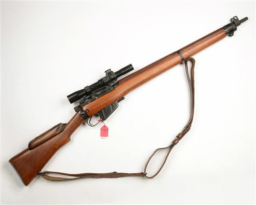 dated for 1944, with 25 1/4in. nitro barrel, dove-tailed blade fore-sight with side protectors, elevating rear battle sight, blackened receiver mounted with a period telescopic sight marked 'TEL SIGHTING No 32 MK III' and 'AK & S', serial no. 17399 dated 1945, twin thumb-wheel operated side-mount with non-matching serial number, manual safety, detachable box magazine with matching number, full-length stock with applied raised comb, the butt-stock stamped 'S51' to the underside, aluminium heel plate, correct stamps throughout and fitted with a period Pattern '08 leather sling.