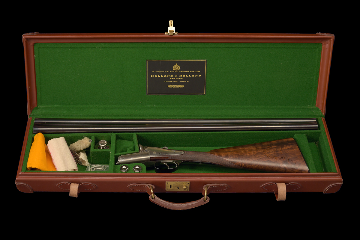 for 1897, 30in. nitro barrels, the rib engraved 'HOLLAND & HOLLAND. 98 NEW BOND STREET. LONDON.', and gold-inlaid '1' at the breech-end, 2 1/2in. chambers, bored approx. true cyl. and 3/4 choke, action with patent gas checks, toplever gold-inlaid '1', automatic safety with gold-inlaid 'SAFE' detail, border engraving, brushed bright and blued finish overall,13 1/2in. figured stock including buttplate, weight 6lb. 8oz., in leather single guncase