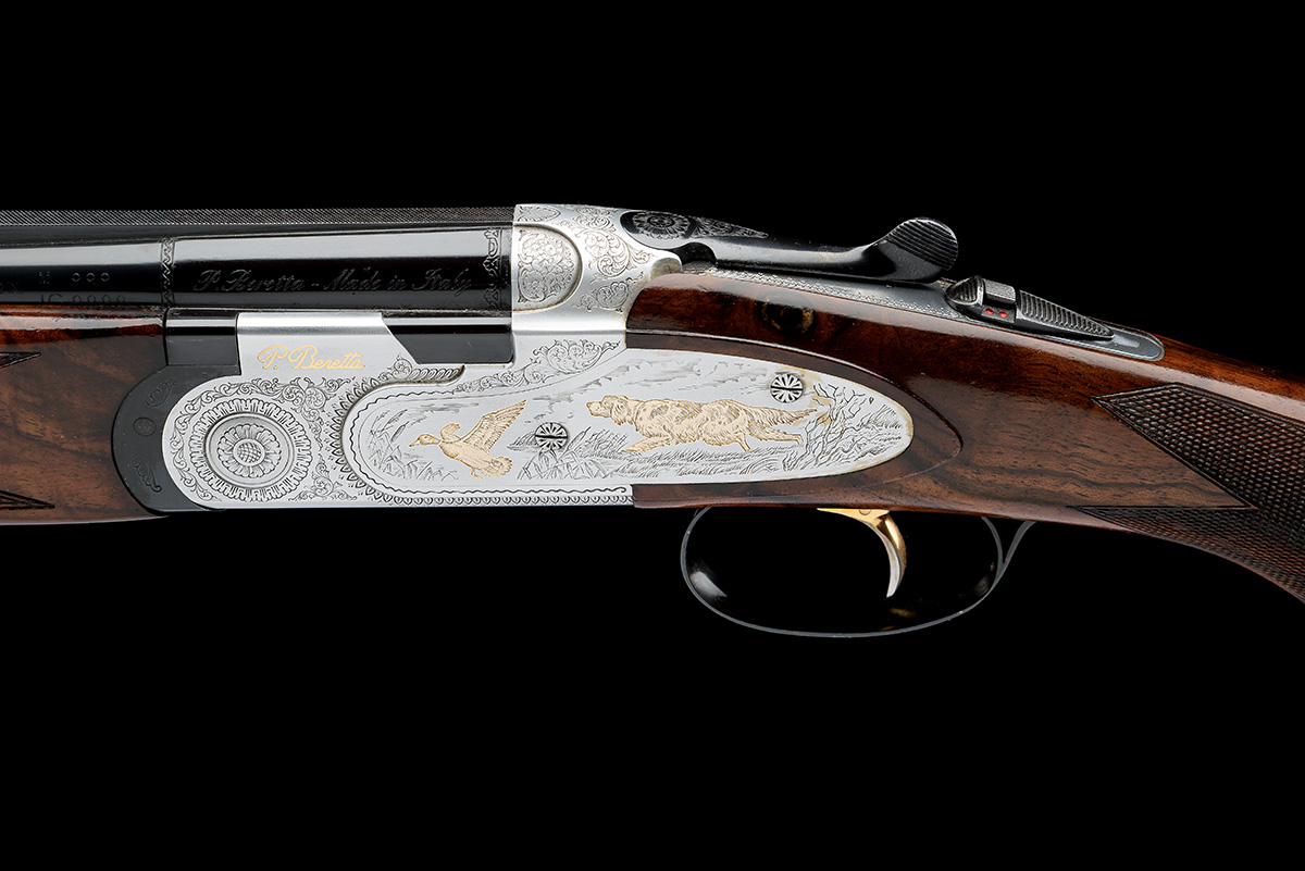 dated 1999, 29 1/2in. nitro barrels with 6mm ventilated matt top-rib, 3in. chambers, multichokes (with spares), hold-open toplever, manual safety with integral barrel selector switch, gold-washed adjustable single trigger, acanthus scroll engraving, the decorative sideplates with gold-inlaid scenes of hound and fowl, the underside gold-inlaid with a pheasant, 14 1/2in. semi-pistolgrip stock including 1in. wooden extension, weight 6lb. 3oz., in its makers universal case