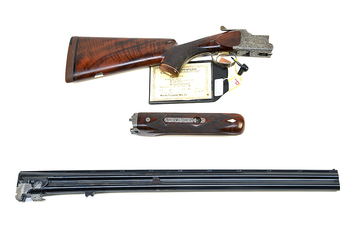 for 1985, 28in. nitro reproved barrels (in 1985) with 13mm ventilated matt top-rib, pearl inset bead fore-sight and intermediate bead-sight, 2 3/4in. chambers, bored approx. 1/4 and 3/4 choke, hold-open toplever, manual safety with integral barrel selector switch, gold-washed single trigger, rolled-edge triggerguard, the action carved in high relief with acanthus scrollwork surrounding game scene vignettes of hound and fowl, the underside with an oval engraved 'B.C. MIROKU PRESIDENT', signed 'M.K.', the furniture and fore-end iron engraved en suite, the triggerguard with a portrait of a spaniel retrieving mallard, sculpted fore-end wood, decorative ivorine diamond-shaped inserts to fore-end and pistolgrip, 14 7/8in. well-figured pistolgrip stock with blank silver shield-shaped escutcheon and including 1in. rubber recoil pad, weight 7lb. 11oz., with original Miroku Inspection Certificate