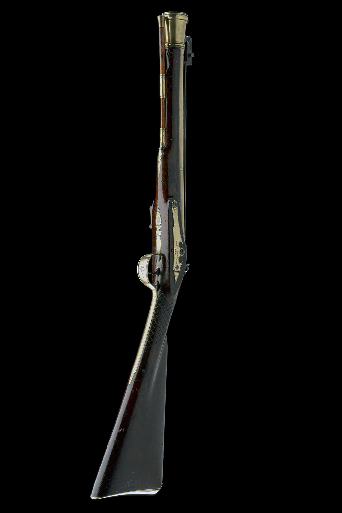 probably Southern Mediterranean circa 1780, with over-under octagonal to round 15in. iron barrels, both muzzles strongly flaring and of oval form, traces of scroll engraving throughout, both breeches struck with repeated oval maker's marks separated by the makers initials in a rectangular frame (illegible), solid top-tang, long bevel-edged lockplate with rectangular aperture to the pointed tail possibly for an absent safety catch or earlier mechanism, the remainder including the swan-necked cock with line scroll engraving, selectable pan tray for top or bottom barrel, short handrail walnut full-stock inlaid with white-metal wire scrolls, a stylised tulip behind the top-tang, a moulded escutcheon to back of wrist and a star to lower right of grip, the heel-plate and heel of butt (diagonally from front of comb to toe) fully covered in embossed sheet white metal featuring stands of flags and military trophies (traces of possible gilding), replacement iron side-plate, sheet iron trigger and bow, incomplete white metal fore-end tip, the right side of fore-end a separate fillet and no provision for ramrod (cleaned overall, some losses to inlet decoration and detail), overall length 25 3/4in., weight approximately 2 5/8lbs.
