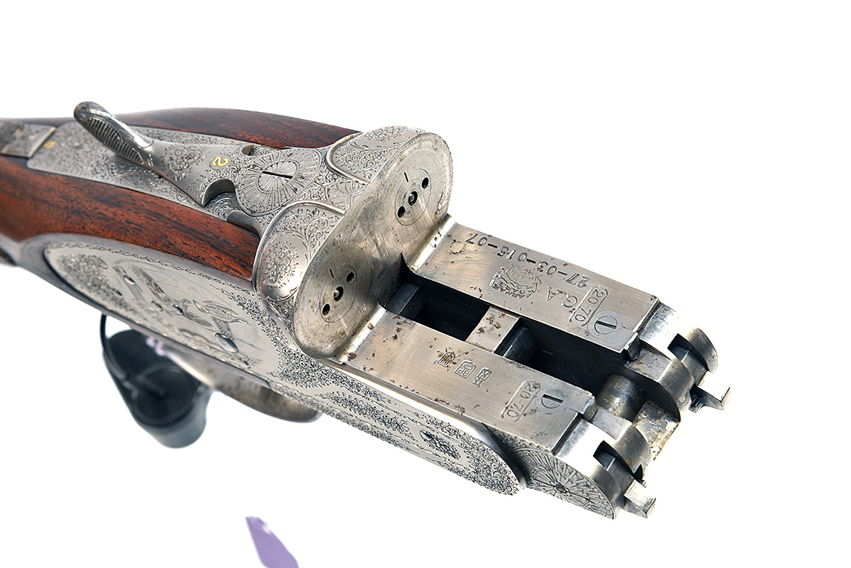 for 2007, 27in. nitro chopperlump barrels, the ribs engraved 'ARMAS GARBI. SPAIN.' and gold-inlaid '1' and '2' at the breech ends, 2 3/4in. chambers, bored approx. 1/4 choke in all, Holland & Holland style self-opening systems, removable striker discs, toplevers gold-inlaid '1' and '2', automatic safeties with gold-inlaid 'S' details, articulated front triggers, acanthus scroll engraving surrounding game scene vignettes of partridge, the undersides with a mallard, old silver finish, 15 1/8in. figured stocks (No.1 with crack to rear of top tang), fore-end finials gold-inlaid '1' and '2', weight 6lb. 5oz., in their leather double motor case with canvas and leather outer