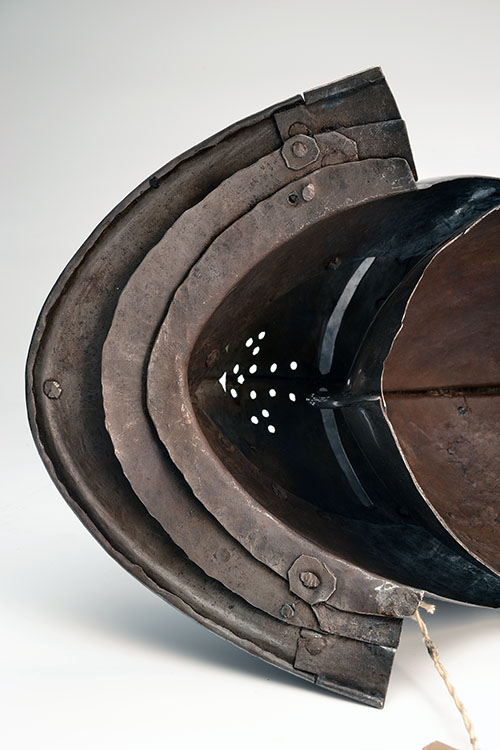 restored most probably mid 19th century and possibly for a funery achievement, the later hinged face-plate pierced with irregular holes and a small 'mouth' slot, twin narrow rectangular 'sights' with rolled lower edges, rolled edge visor attached by six brass rivets, late 16th century two-piece skull with central comb (provision for hanging hook, missing) and lift-up chin-plate with articulated plate neck-guard (two, possibly more neck-plates replaced) and side mounted hook closure (some heavy cleaning and light age cracking throughout)