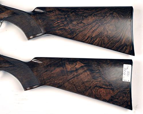 30in. nitro barrels with 6mm ventilated matt top-ribs gold-inlaid 'I' and 'II' at the breech ends, 2 3/4in. chambers, bored approx. 1/4 and 1/2 choke, hold-open toplevers gold-inlaid 'I' and 'II', manual safeties with integral barrel selector switches, actions engraved with bold acanthus scrolls, cross hatch bordering and the undersides with a vignette of an English partridge in flight, the decorative sideplates with scenes of mallard alighting and a brace of cock pheasants, triggerplates signed 'C BAERTEN', old silver finish overall, 14 5/8in. very highly-figured pistolgrip stocks including buttplates, weight 6lb. 10oz., in their lightweight leather motor case with canvas and leather outer