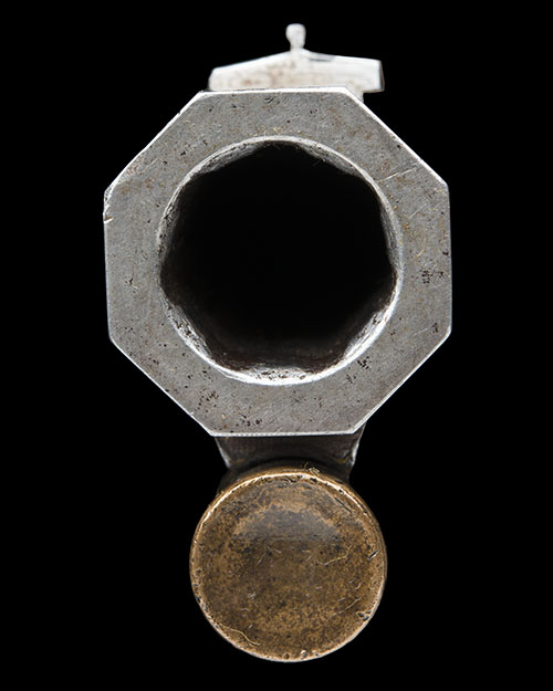 circa 1840, possibly converted from an earlier flintlock, with browned octagonal 29 1/2in. barrel, replacement dove-tailed sights, engraved bands at breech with platinum line and vented plug, flat slightly curved borderline and scroll engraved lock, sliding safe behind the scroll engraved dolphin headed hammer, figured walnut half-stock with iron furniture including heel-plate and raised pistol-gripped lower tang, gold oval escutcheon to the wrist engraved with a crowned garter, flat underside to butt fitted with an eyelet for sling, twin barrel keys with plain gold escutcheons, under-barrel rib with original mahogany ramrod, the rear pipe with eyelet for sling (fore-end cracked and expertly repaired on left hand side); TOGETHER WITH a possibly associated storage case lined with green baize (compartments loose), the outer covered with a blacked canvas