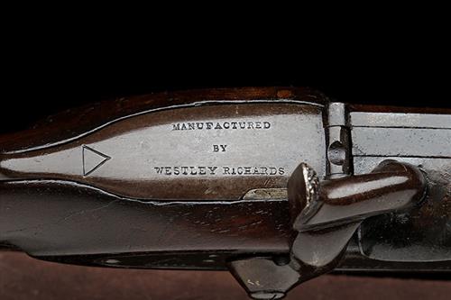 dated for 1882, with 25in. barrel, the breech end marked 'WHITWORTH PATENT', block and blade fore-sight, elevating ladder rear-sight, lift-up trapdoor action stamped 'MANUFACTURED BY WESTLEY RICHARDS' together with the 'triangle' trademark, plain lockplate signed 'WESTLEY RICHARDS & Co.', the 'triangle' trademark with date, walnut full-stock with iron furniture (cracked and repaired along left cheek), iron barrel-band and complete with clearing rod and a later leather sling.