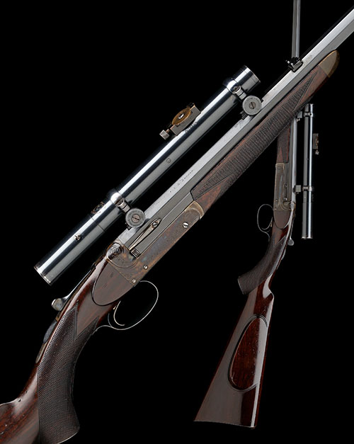 26in. lined nitro octagonal barrel (originally in .290 Rook), partially file cut top flat with open sights and two folding leaf sights, bead fore-sight, the breech end dovetailed with telescopic sight rails and mounted with an Ajack telescopic sight, carved teardrop fences, automatic safety with gold-inlaid 'SAFE' detail, non-selective ejector, fine acanthus scroll engraving, retaining much renewed colour-hardening and finish, 14 3/4in. figured pistolgrip stock with cheekpiece, engraved steel pistolgrip-cap and steel buttplate, snap fore-end with horn finial, weight 6lb. 8oz.