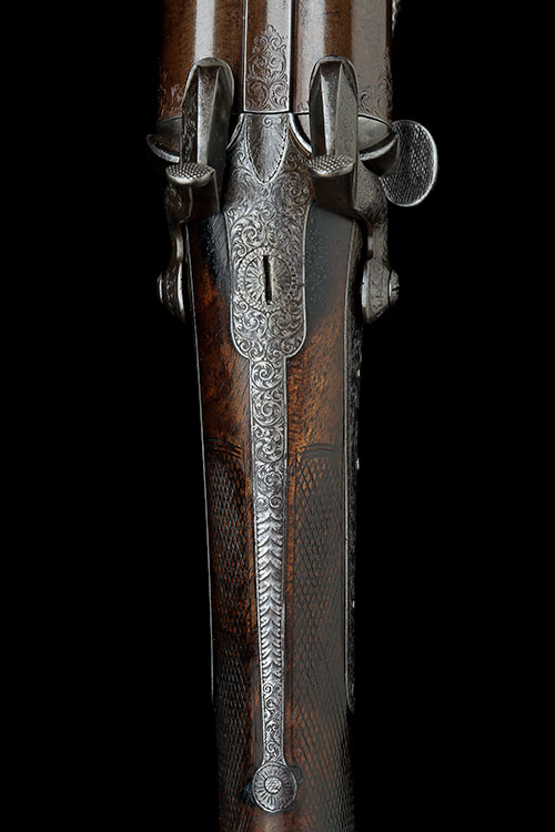 30in. bold twist barrels, rib engraved 'J.D. DOUGALL. 23 GORDON ST. GLASGOW' and with scroll detailing at the breech end, Dougall 'lockfast' patent action, patent no. 1128 of 7th May 1860, rearward facing articulated sidelever with side retaining catch, carved serpentine fences, action face with protruding bosses, standing breech with further cylindrical stud (engages with a recess in lump), non-rebounding back-action locks with finely engraved faceted hammers, best border and fine scroll engraving, the lockplates with a scrolling banner engraved 'DOUGALL', the triggerguard with the Glasgow coat of arms and motto 'LET GLASGOW FLOURISH', some wear and external pitting overall, 14 1/2in. stock with steel buttplate, weight 7lb. 2oz.