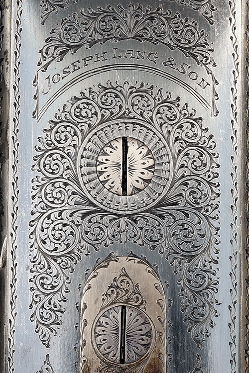 26in. nitro barrels, ribs engraved '1' and '2' at the breech ends (No.1 gold-inlaid), tubes engraved 'JOSEPH LANG & SON. 7, BURY STREET, ST. JAMES'S, LONDON, ENGLAND', 2 3/4in. chambers, bored approx. 1/4 and 1/2 (No.1) and full choke in both (No.2), scalloped-back actions with slender fences, toplevers gold-inlaid '1' and '2', automatic safeties with gold-inlaid 'SAFE' details, fine border and acanthus scroll engraving, the makers name in cartouches to the sides and undersides, retaining some original colour-hardening and finish, 15 5/8in. stock (No.1) and 16in. stock including 3/8in. wooden extension (No.2), fore-ends with Anson push rod release catches, the finials gold-inlaid '1' and '2', weight 6lb. 6oz. (No.1) and 6lb. 12oz. (No.2), in their canvas and leather motor case with gold-tooled Atkin, Grant & Lang Bury St. address trade label