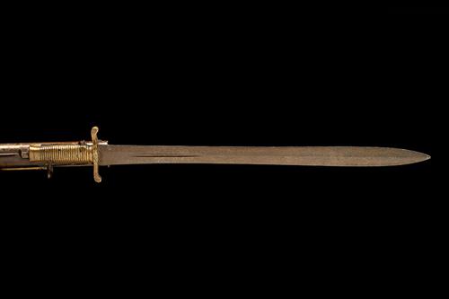 lock dated for 1864, with iron 30in. two-groove rifled barrel, boat-shaped fore-sight, rear-sight with one standing and one folding leaf, scarce variant bayonet bar with central locking notch mounted on the right side of muzzle, borderline engraved bar-action lock signed 'TOWER' with the date and a 'V.R.' crown device at tail, walnut full-stock with brass furniture including large patchbox in butt, iron stirrup swivels and iron under-barrel ramrod (woodwork with some wear, staining to iron surfaces); COMPLETE WITH its brass hilted double edged bayonet, no scabbard (bladed lightly rusted, some bruising to hilt