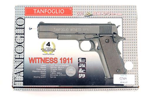 A BOXED .177(BB) CO2 REPEATING AIR-PISTOL SIGNED TANFOGLIO, MODEL 'COLT 1911 WITNESS', serial no. 10605891, recent, in imitation of a Colt pistol of the same name, with recoiling slide and chequered plastic grips; IN ITS makers carton appearing little used with instructions
