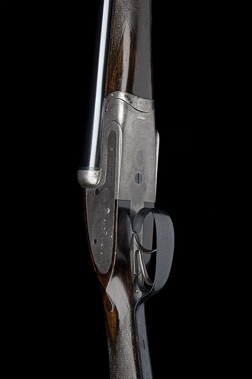 30in. nitro reproved barrels, rib engraved 'H. TRULOCK HARRISS. PICKERING PLACE. ST. JAMES'S STREET. LONDON. S.W.', and gold-inlaid '1' at the breech end, 2 3/4in. chambers, bored approx. 1/4 and full choke, left wall at 19, treble-grip action with hidden third bite, toplever gold-inlaid '1', automatic safety with gold-inlaid 'SAFE' detail, arrow cocking-indicators, best fine acanthus scroll engraving with floral bouquets, brushed and reblued finish overall, 14 3/8in. well-figured stock including horn buttplate, weight 6lb. 9oz.