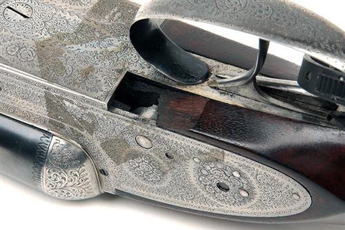 28in. replacement nitro barrels (circa 1975, barrel number 15838), rib engraved 'WILLIAM POWELL & SON. 35 CARRS LANE. BIRMINGHAM.', and gold-inlaid '1' at the breech end, 2 1/2in. chambers, bored approx. 1/4 and 1/2 choke, some pitting, treble-grip action, toplever gold-inlaid '1', automatic safety with gold-inlaid 'SAFE' detail, fine acanthus scroll engraving with floral bouquets, brushed finish overall, 14 3/8in. well-figured stock (damage to right underhorn), weight 6lb. 6oz.