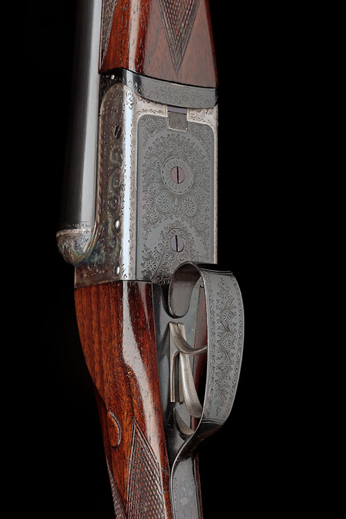 28in. nitro barrels, 2 3/4in. chambers, bored approx. 1/4 and 3/4 choke, automatic safety, border and acanthus scroll engraving, retaining traces of original colour-hardening and finish, 14 5/8in. stock with drop points, fore-end with brass pin, weight 6lb. 7oz.