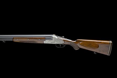 27 5/8in. (70cm) nitro reproved barrels (in 2017) with 8mm solid matt top-rib, 2 3/4in. chambers, bored approx. 3/4 and full choke, three-piece fore-end with wooden side fillets, bolstered action, manual safety, hand-detachable lockplates, cocking-indicators, articulated front trigger, bold Germanic scroll engraving, bright and blued finish, 15 1/8in. pistolgrip stock with cheekpiece, pistolgrip-cap, sling swivels and including 7/8in. ventilated rubber recoil pad, weight 7lb. 3oz.