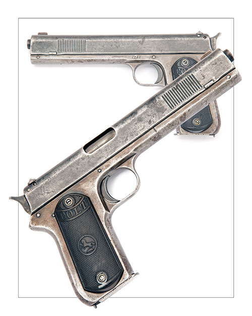 for 1902, with blued slide milled with frontal serrations, blade fore-sight, hammer safety rear-sight converted to conventional, the right side marked 'AUTOMATIC COLT CAL .38 RIMLESS SMOKELESS', the left 'BROWNING PATENT PAT'D APRIL 20 1897' along with the Colt address, plain frame with no slide hold open, external spurred hammer, chequered hard rubber grips and heel magazine release, the base of magazine marked 'PAT'D SEPT 9 1884', fair traces of faded finish throughout