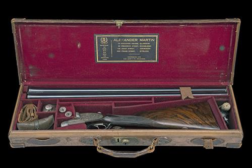 26in. nitro reproved chopperlump barrels, rib engraved 'ALEX MARTIN. 20 EXCHANGE SQUARE. GLASGOW. & AT EDINBURGH. ABERDEEN. & STIRLING.', with bold celtic strapwork at the breech end and bands of the same to the breech end of the barrels, 2 1/2in. chambers, bored approx. true cyl. and 3/4 choke, treble-grip action with hidden third bite, automatic safety with gold-inlaid 'SAFE' detail, rolled-edge triggerguard, bold engraving of celtic knots, strapwork and serpents carved in low relief on a matted background, retaining some original colour-hardening and finish, 14 1/2in. highly-figured stock (slightly swept left side), weight 6lb. 6oz., in its leather case with gold-tooled Alexander Martin leather trade label, the case lid exterior marked 'T.T. Mc C.'