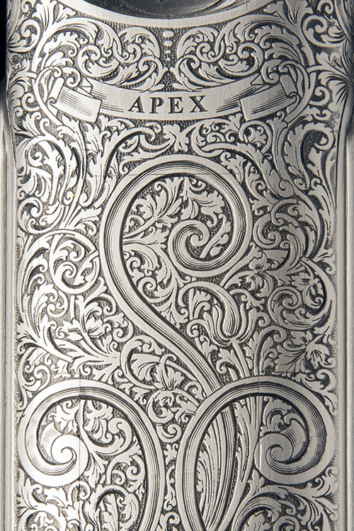 32in. nitro barrels with 10mm ventilated matt top-rib with intermediate bead sight, ventilated mid rib, 2 3/4in. chambers, extended multichokes (no spares), hold-open toplever, manual safety with integral barrel selector switch, adjustable single trigger, the action, decorative sideplates and furniture fully engraved with acanthus scrollwork and with occasional gold-highlighted floral designs, the underside with a scrolling banner engraved 'APEX', triggerplate signed 'Bottega C Giovanelli', bright finish overall, 15in. pistolgrip stock with palm swell, skeletal steel pistolgrip-cap and including 5/8in. rubber recoil pad, weight 8lb. 8oz.