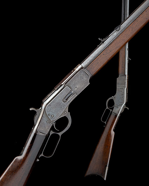 for 1880-81, with octagonal 24 1/4in. barrel, dove-tailed fore-sight with nickel blade, buckhorn rear-sight, the top of barrel signed 'WINCHESTER'S-REPEATING-ARMS, NEW HAVEN CT. KINGS-IMPROVEMENT-PATENTED-MARCH 29 1866, OCTOBER 16 1860', iron receiver with sliding dust-cover and screw down guide rail, straight-hand butt-stock with crescent iron heel-plate fitted with a central sliding trapdoor, walnut fore-end, iron nose-cap, full-length magazine tube, retaining a good amount of original finish