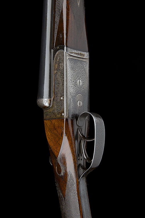 30in. nitro barrels, rib engraved 'W.J. JEFFERY & CO. LTD. 9. GOLDEN SQUARE. REGENT STREET. LONDON. W.', 2 1/2in. chambers, bored approx. 1/4 and 3/4 choke, some pitting, automatic safety, beaded border and bold acanthus scroll engraving, retaining traces of original colour-hardening and finish, 15 3/4in. stock including 1in. wooden extension, weight 7lb. 2oz.