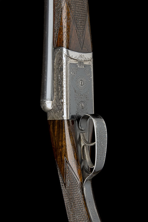 30in. nitro barrels (loose on action) with raised tapered file-cut rib, 2 3/4in. chambers, bored approx. true cyl. and 1/4 choke, scroll-engraved action, automatic safety, retaining very slight traces of original colour-hardening and finish, 14in. semi-pistolgrip stock, weight 7lb.