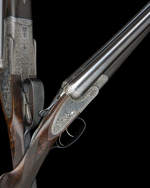 28in. nitro barrels, rib engraved 'WILLIAM EVANS (FROM PURDEY'S) 63 PALL MALL. ST. JAMES'S. LONDON.', and gold-inlaid '1' at the breech end, 2 1/2in. chambers, bored approx. imp. cyl. and 1/2 choke, treble-grip action with removable striker discs, toplever gold-inlaid '1', automatic safety with gold-inlaid 'SAFE' detail, the action, lockplates and furniture finely carved with art nouveau scrolling acanthus designs, retaining traces of original colour-hardening, lockplates and furniture slightly swept, 13 3/4in. boldly-figured replacement stock slightly swept at comb, weight 6lb. 8oz., in a brass-cornered leather hammergun case with gold-tooled William Evans trade label