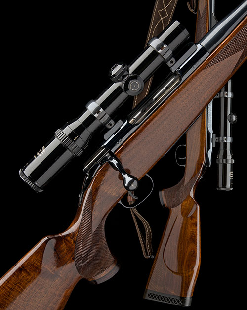 23 5/8in. nitro barrel with open sights and ramp-mounted bead fore-sight, receiver mounted with a Schmidt & Bender 1 1/4-4x20 telescopic sight, serial no. 74395, manual tang safety, detachable box magazine, well-figured pistolgrip stock with cheekpiece, hogsback comb, leather sling, 14 1/8in. pull including 3/4in. ventilated rubber recoil pad and extension, weight 9lb. 6oz., with a universal case and detachable stock-mounted canvas ammunition holder