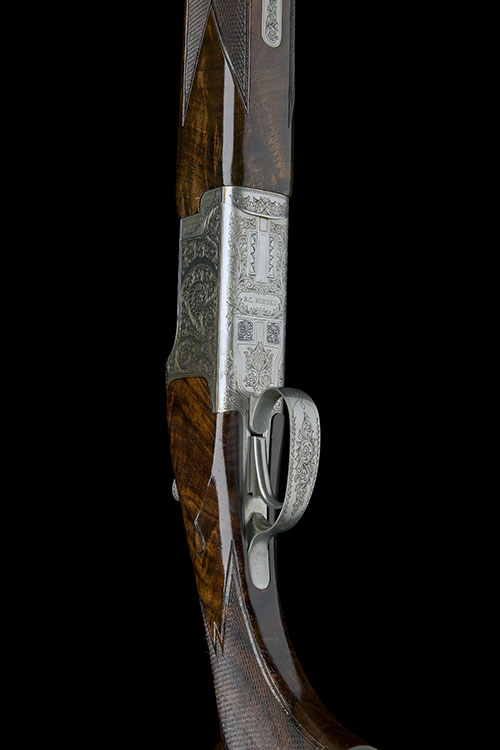 28in. nitro reproved barrels with 6mm ventilated matt top-rib, 3in. chambers, bored approx. imp. cyl. and 1/2 choke, hold-open toplever, manual safety with integral barrel selector switch, beaded border and acanthus scroll engraving, old silver finish, 14 1/2in. figured pistolgrip stock with trademarked buttplate, weight 6lb. 10oz., in a Winchester universal case, with instruction manual, original Miroku Inspection Certificate and Liege proof certificate