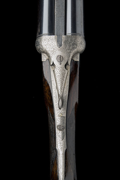 26in. nitro chopperlump barrels with matt sight rib, open sights and folding leaf sight, ramp-mounted bead fore-sight with flip-up moonsight, the tubes engraved 'AUGUSTE FRANCOTTE. BREVETE A LIEGE', treble-grip action with removable striker discs, elongated top strap with manual safety, articulated front trigger, profusely engraved with fine acanthus scrolls and with beaded and bold scrolling acanthus bordering, bright finish, 14 1/2in. figured pistolgrip stock with cheekpiece, engraved steel pistolgrip-cap (with trap) and including 7/8in. rubber recoil pad, 11lb. 2oz.
