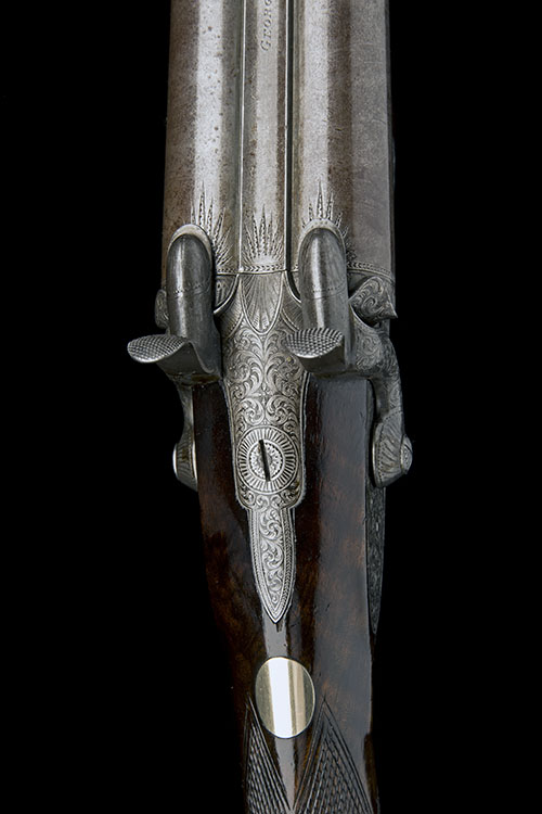 circa 1870 and possibly converted from muzzle-loading, with 29 3/4in. twist iron barrels, the top-rib signed 'GEORGE HIGHAM, WARRINGTON', the pin apertures and rib-end at breech engraved with flambeau needles, carved fences, fully border and scroll engraved top-tang, border and scroll engraved bar-action locks signed 'GEORGE HIGHAM' (strong traces of colour), highly figured chequered walnut butt with gold oval escutcheon at the wrist, scroll engraved iron heel-plate with short top-spur, fully engraved iron furniture including lower tang grip-safety, push-forwards under-lever opening, and fully chequered splinter fore-end held with a single key