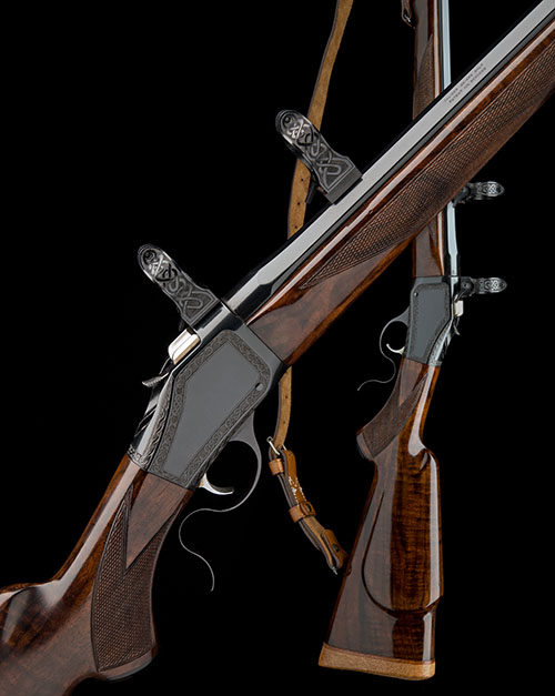 26in. unsighted octagonal nitro barrel, the breech end mounted with celtic knot-engraved quickly-detachable telescopic sight rings, blued action with bands of celtic knotwork, 14in. figured pistolgrip stock with cheekpiece, raised comb, sling swivels (with leather sling) and including 7/8in. leather covered recoil pad, weight 8lb. 4oz.