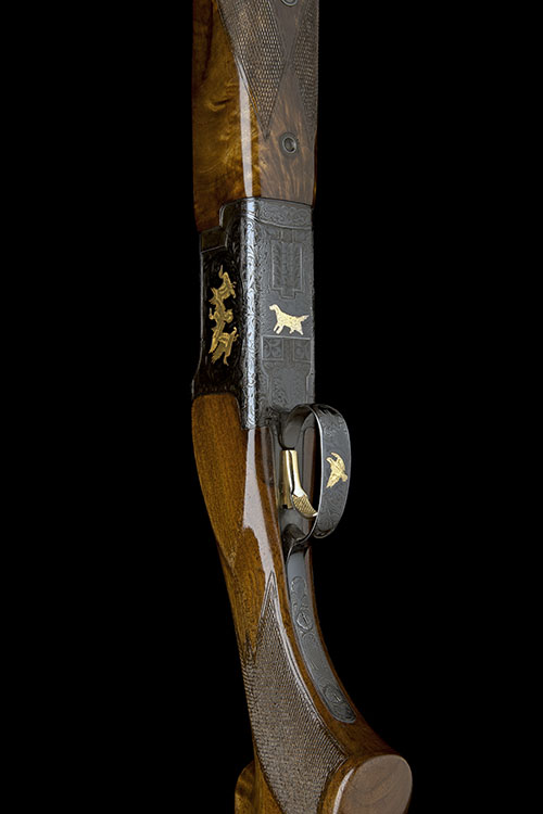 28in. nitro reproved barrels with 9mm raised ventilated matt top-rib and intermediate bead sight, 2 3/4in. chambers, multichokes (with spares), hold-open toplever, manual safety with integral barrel selector switch, chequered gold-washed trigger, black action with scrollwork and gold-inlaid with game birds, the underside with a dog, 14 1/2in. pistolgrip stock including 1 1/8in. ventilated rubber recoil pad, beavertail fore-end, weight 8lb. 10oz.