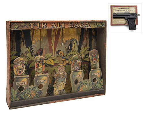 the target probably French, circa 1890 and designed for cork or pea-firing guns and comprised of a pine box with jungle themed illustrations, the foreground with four 'jars', each with a target aperture to release the elasticated 'thieves', the centre with a central figure of Ali Baba with a detachable elasticated head (some water staining, worm and other damage), together with a 'BRITISH AUTOMATIC MAGAZINE PISTOL' of cast iron construction, 4 3/4in. overall length, much original black painted finish and in its manufacturer's carton with printed instructions on the lid