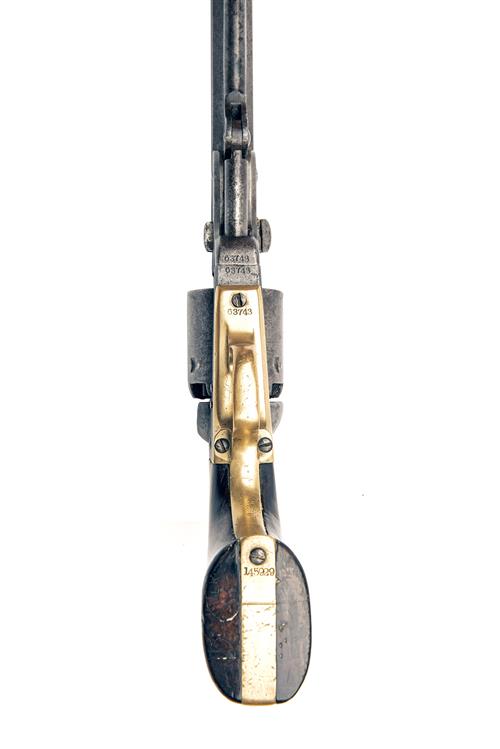 for 1856, with octagonal 7 1/2in. barrel, the top-flat signed 'ADDRESS SAML. COLT NEW YORK CITY', articulated under-barrel rammer, open iron frame stamped 'COLTS PATENT U.S.', plain cylinder with traces of scene, brass grip-straps and trigger-guard, the back-strap a working replacement and numbered '145929', smooth walnut flared grips, the right hand side carved with a large letter 'H' (possibly a ranch marking), stained with some mild pitting