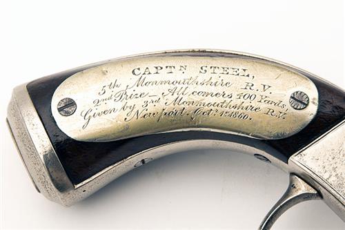 dated for 1860, with blued octagonal 4 3/4in. barrel, small blade fore-sight, plain cylinder, each chamber sequentially numbered, borderline and scroll engraved open frame with later nickel plating, half-strap with rear-sight, self cocking action with hammer-nose safe, smooth walnut grips, the right with large applied nickel plaque reading 'CAPTN. STEEL, 5TH MONMOUTHSHIRE R.V., 2ND PRIZE - ALL COMERS 400 YARDS, GIVEN BY 3RD MONMOUTHSHIRE R.V. NEWPORT, OCT 1ST 1860', moulded butt-cap and hinged ramrod mounted to left of barrel