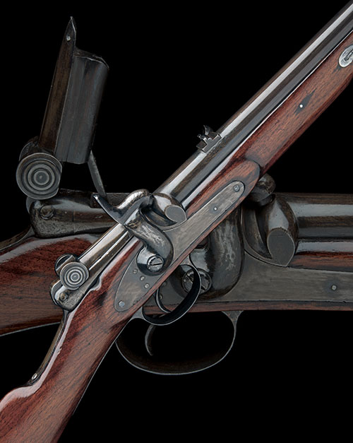possibly a variant 'MERRILL'S PATENT', with round 21 1/4in. barrel, block fore-sight, standing notch rear-sight, integral receiver with loading aperture to the top accessed via a double-linked toggle-action bolt, plain lock and side-hammer, walnut full-stock, iron furniture, one barrel-band at nose and replacement loose ramrod, the original, captive, now absent, saddle-bar fitted to left hand side, refinished throughout and devoid of detail