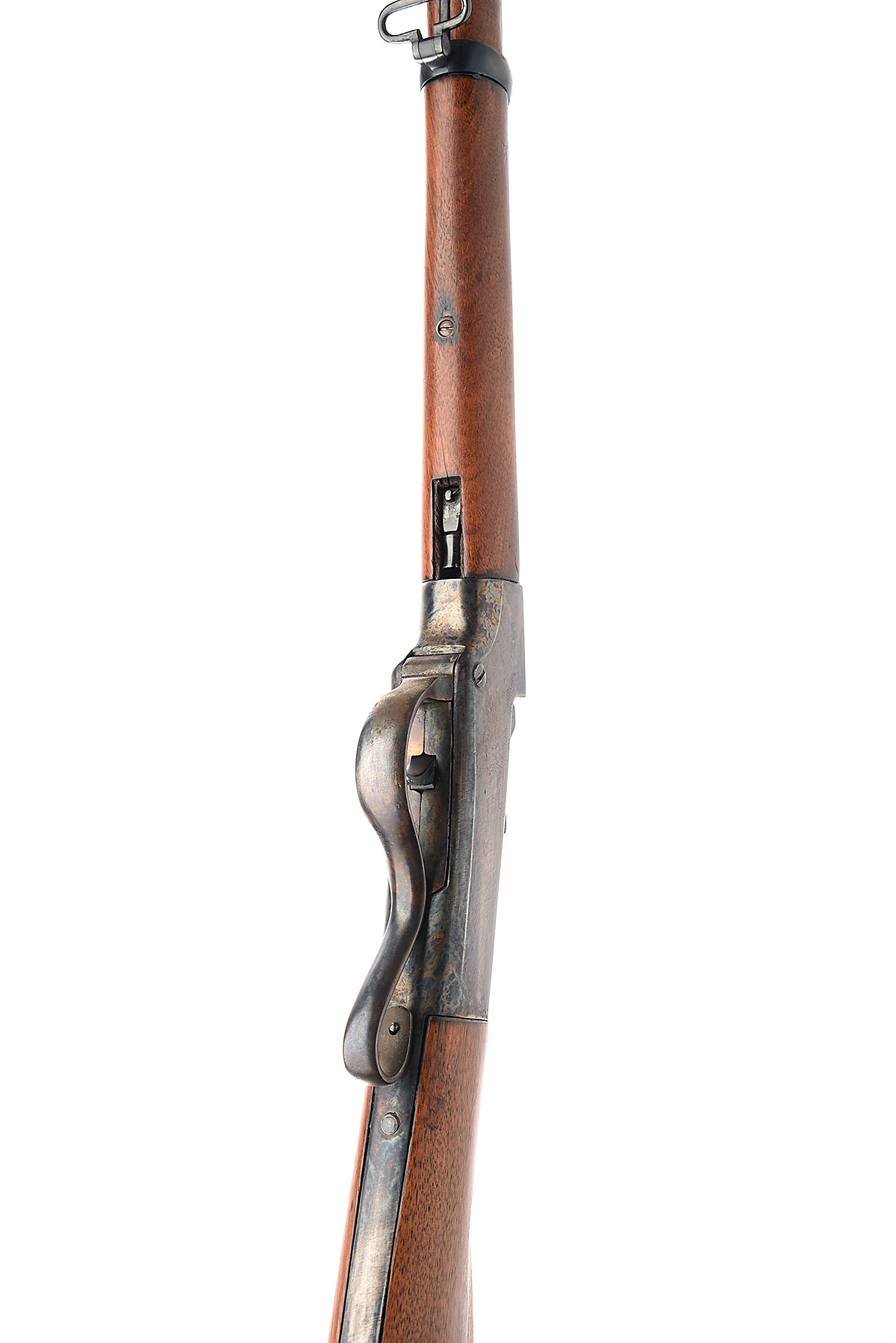 A 56/52 (SPENCER) RIMFIRE BALLARD FALLING BLOCK CARBINE CIRCA 1863, no visible serial number, with 22" rifled barrel, pinched pattern front-sight, flip leaf battle-sights, two piece iron mounts walnut stock, half forend with one spring retained barrel band. The action features an under-lever operated falling block with centre hammer. It is believed that only 1800 Ballard carbines were produced in 56/52 Spencer calibre the bulk of production being in .44 (Henry). The carbine refinished overall with deep blue finish to barrel and case colours to action, loss of all markings and some sharpness.