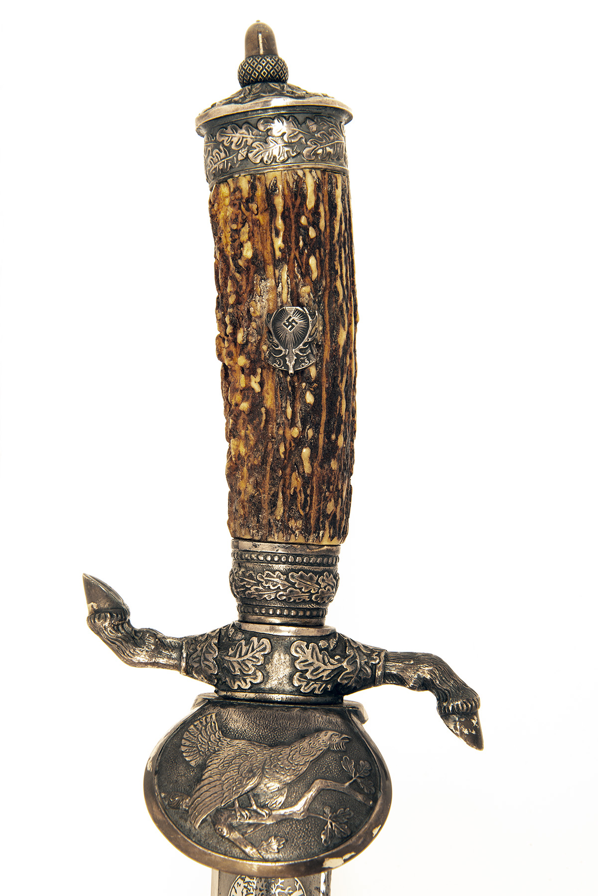 early middle 20th century, with 10in. single-edged spear-point fullered blade etched with hunting scenes and game on each side, silvered hilt with downturned shell guard decorated in relief with a capercaillie in low relief, the cross-guard with vertically recurved quillons terminating in hoof finials, natural staghorn grip with applied Nazi Hunting Association insignia, pommel carved with oakleaves and mounted with acorn finial, complete in original green leather scabbard with plated and engraved mounts
